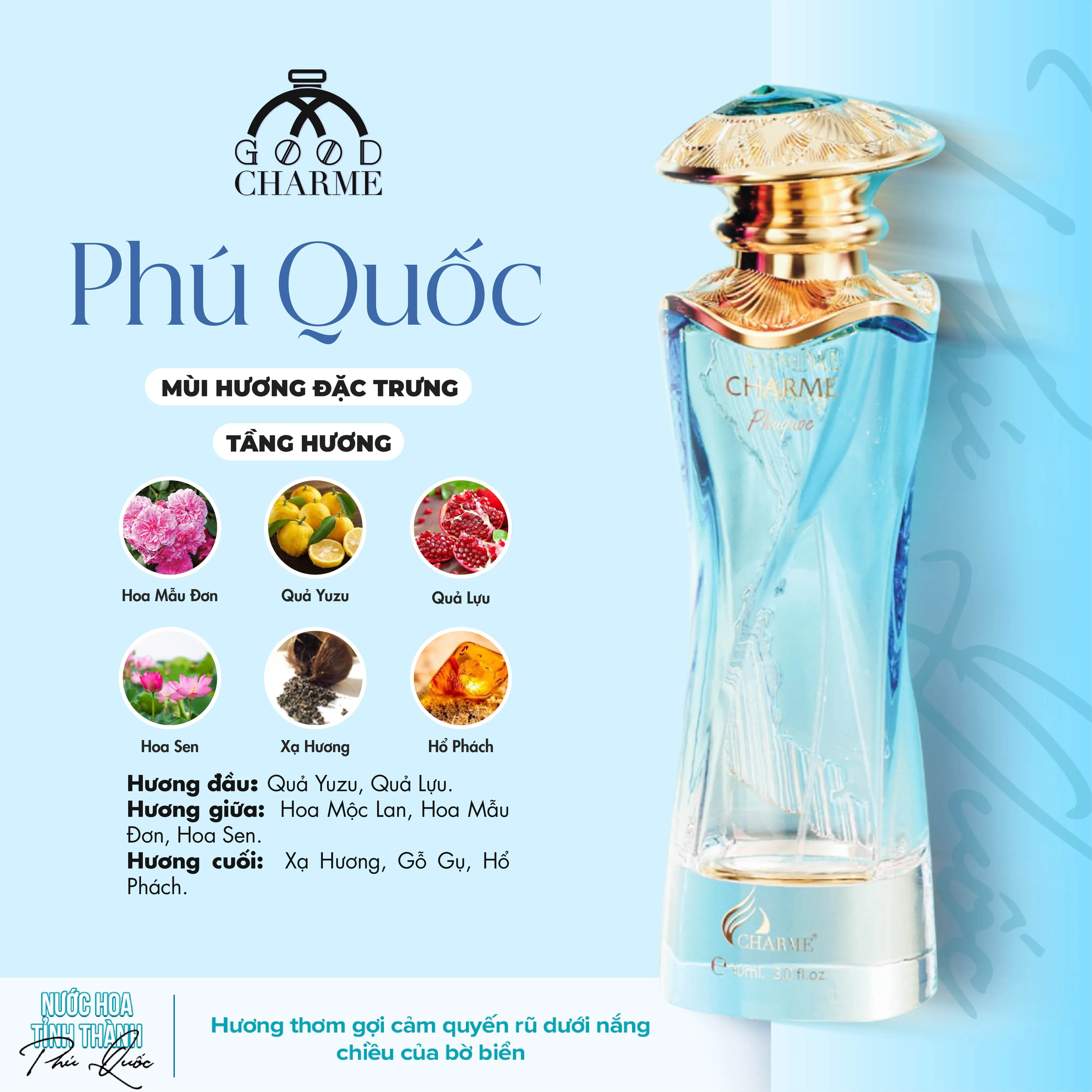 Đặc trưng của thiên nhiên hoang sơ và biển cả Phú Quốc, chai nước hoa này mang đến cảm giác dễ chịu, thư thái, như không gian bình yên của đảo ngọc.